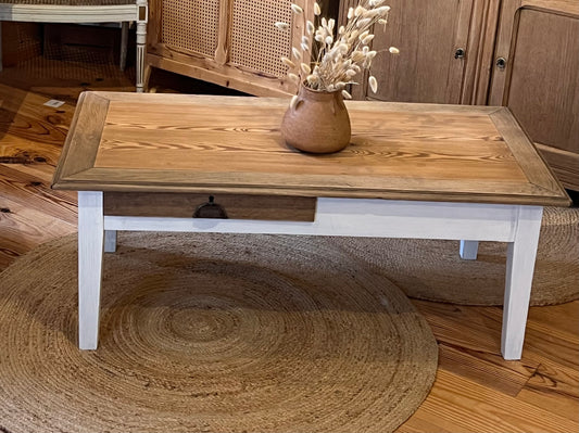 Table basse de ferme ancienne 1 tiroir en bois massif brut